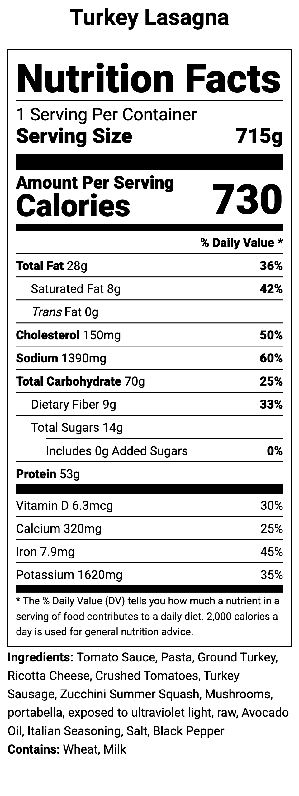 Everyone loves a good lasagna, and this turkey variant is a fresh twist on a classic dish. Lean ground turkey with a vegetable medley, fresh tomato sauce, ricotta cheese, and fresh mozzarella, all topped with a sprinkle of parsley.