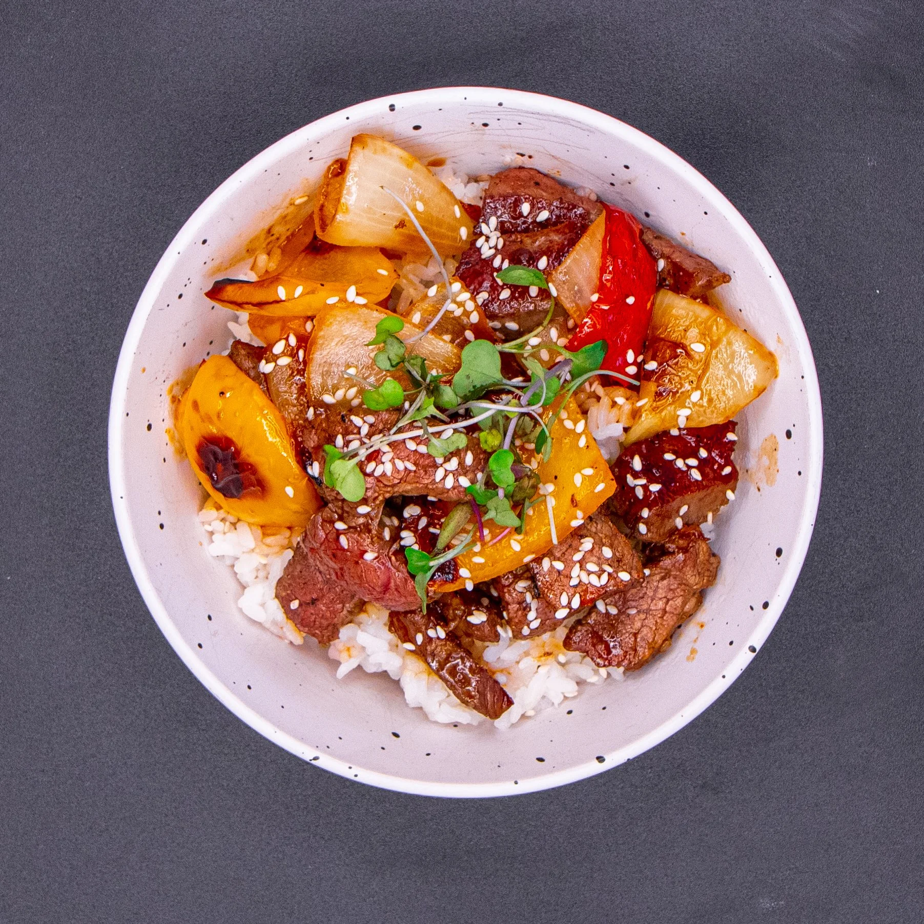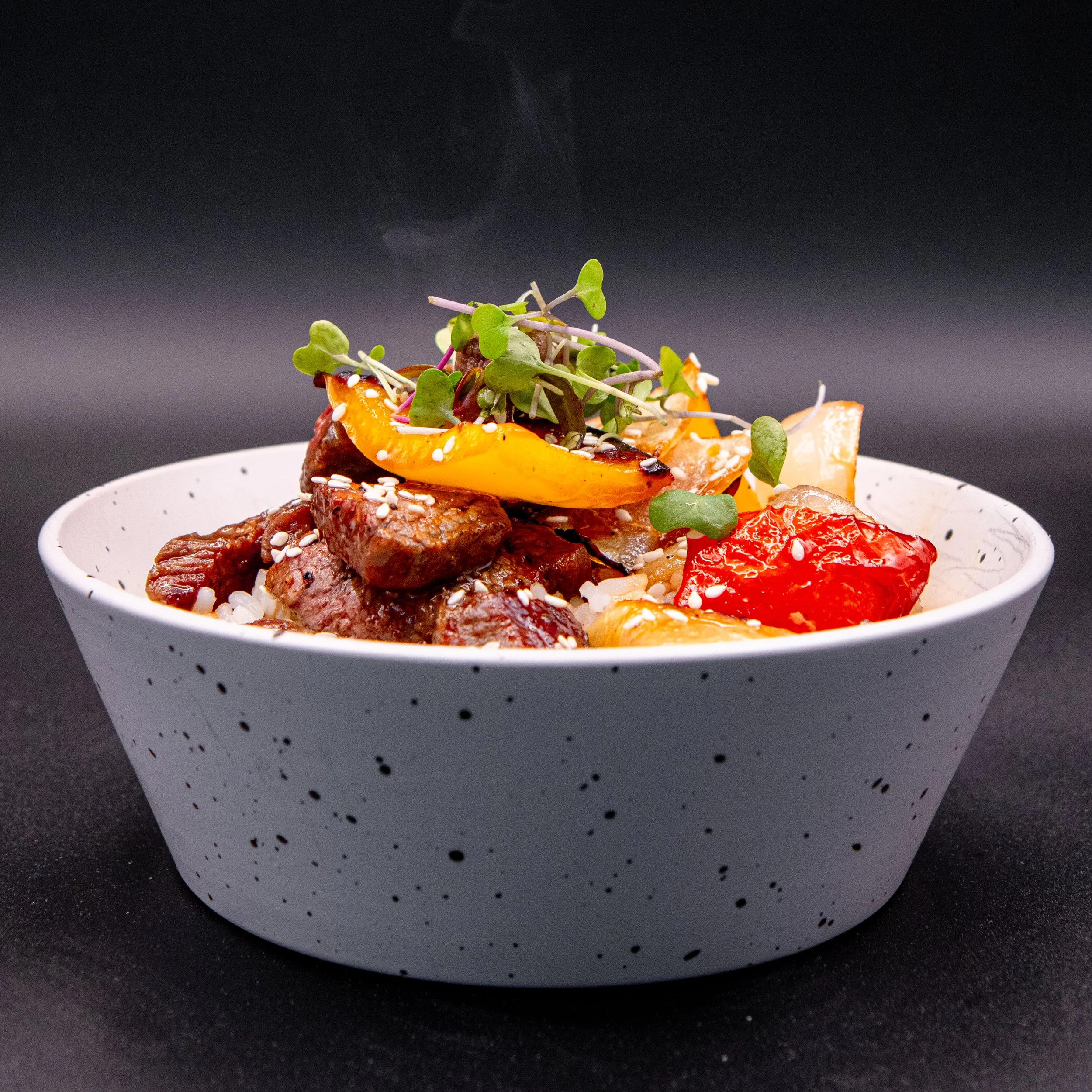 Shredded chicken breast coated in a savory chipotle aioli with a mild kick. Served with Spanish brown rice and roasted sweet peppers.