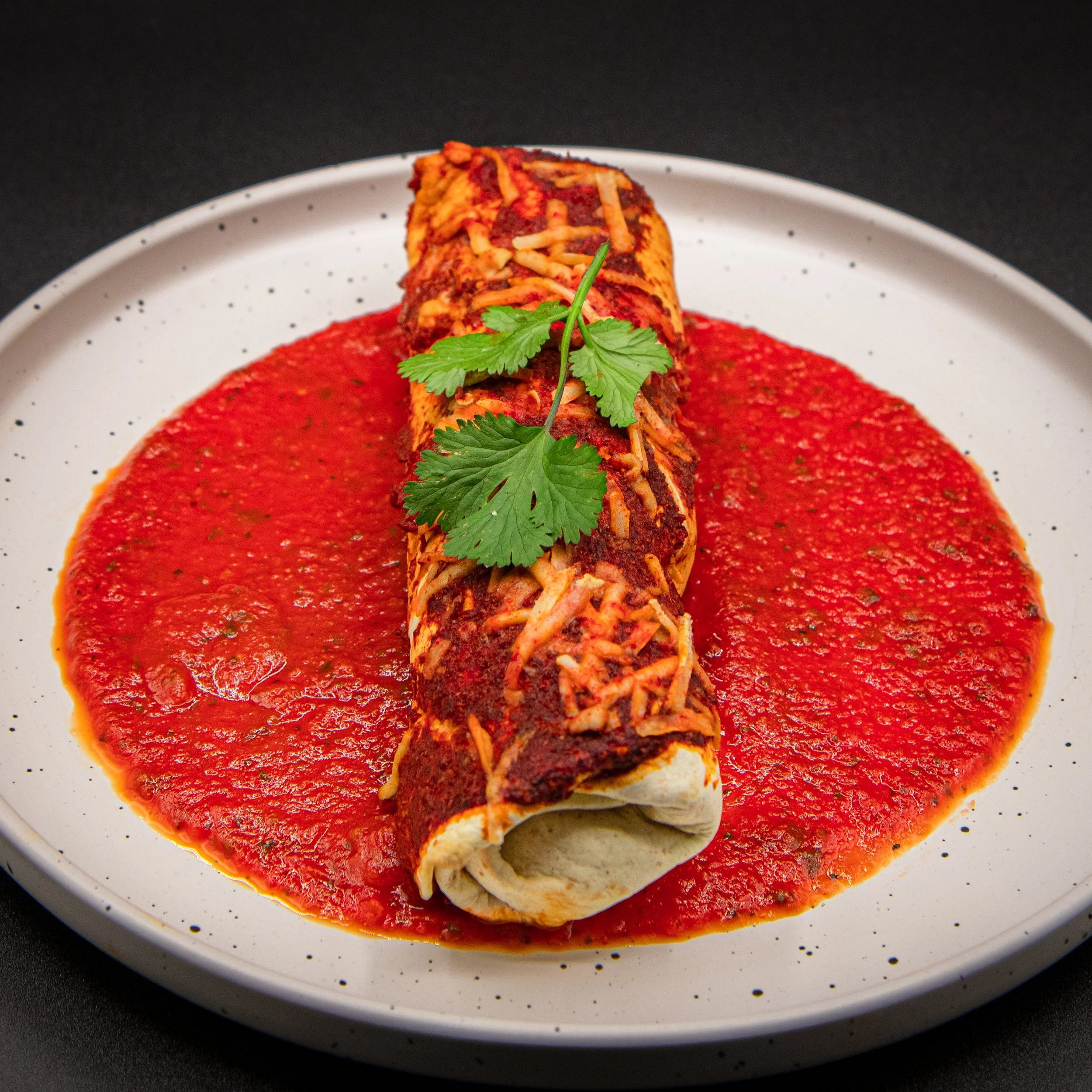 One of our most requested entrees of all time. A delicious black bean enchilada filled with refried beans, black beans, spinach, and sweet potatoes, topped with a guajillo chili sauce, mozzarella, and cilantro.