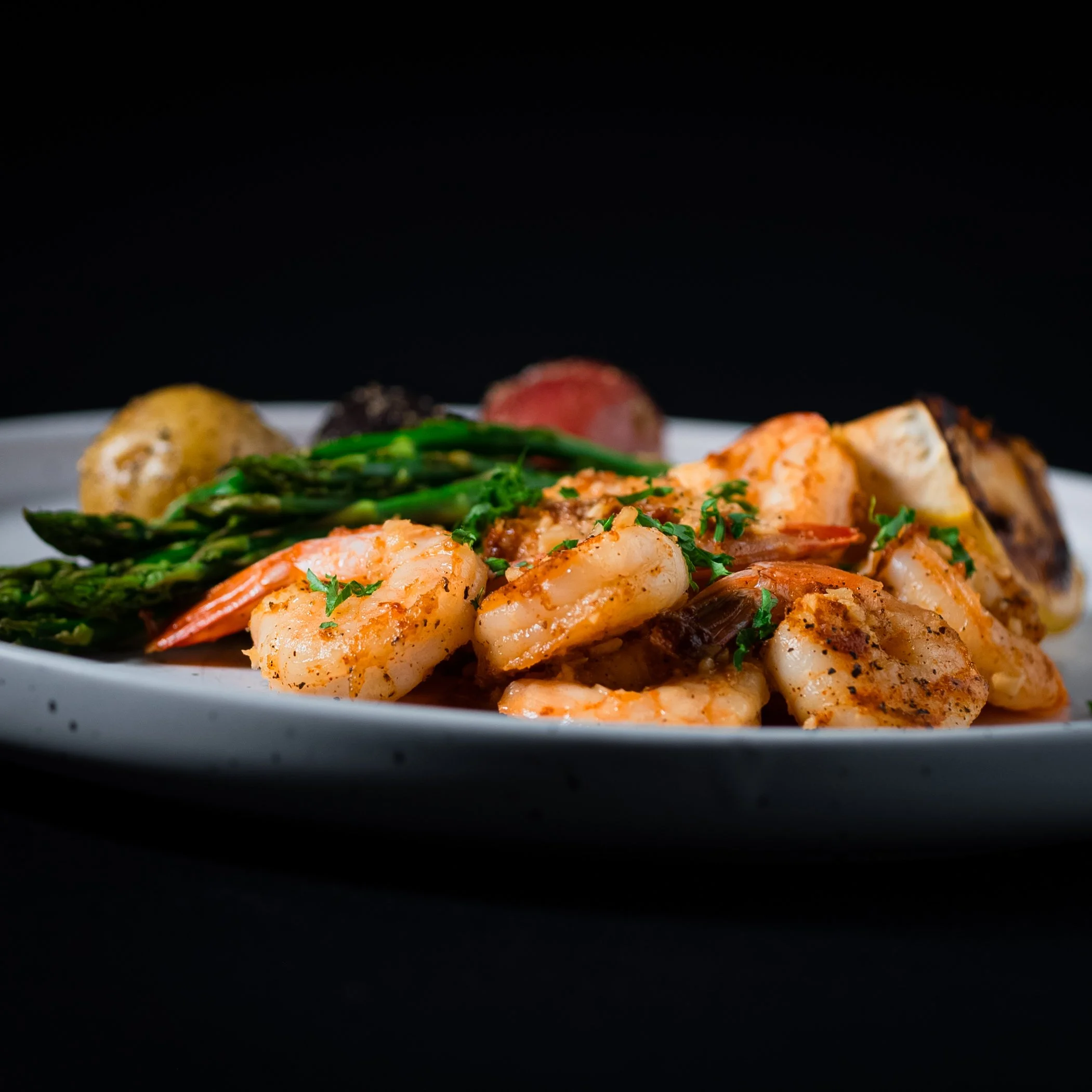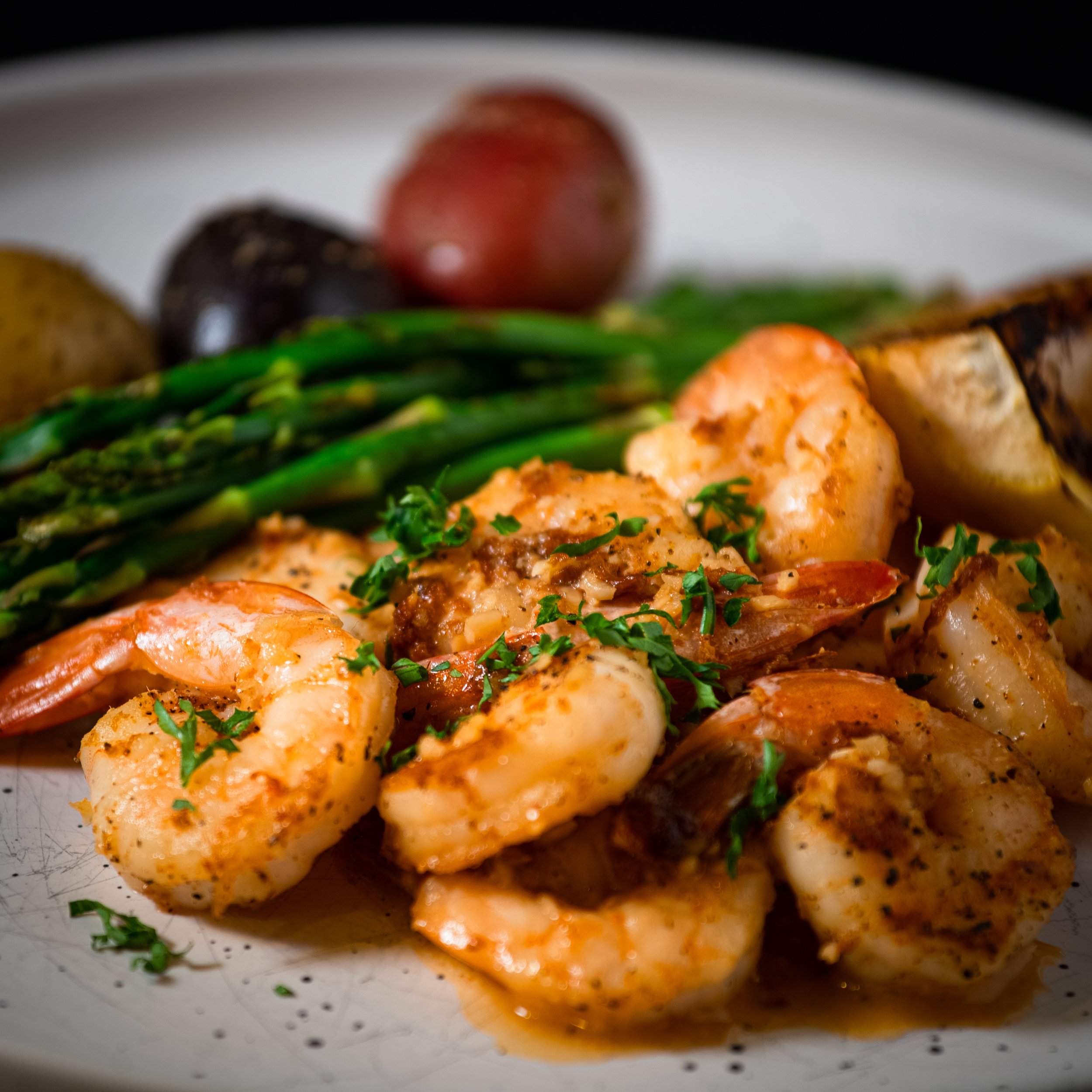 Perfectly pan-seared shrimp with soft, herbed baby potatoes, seasoned roasted asparagus, and a garnish of parsley.