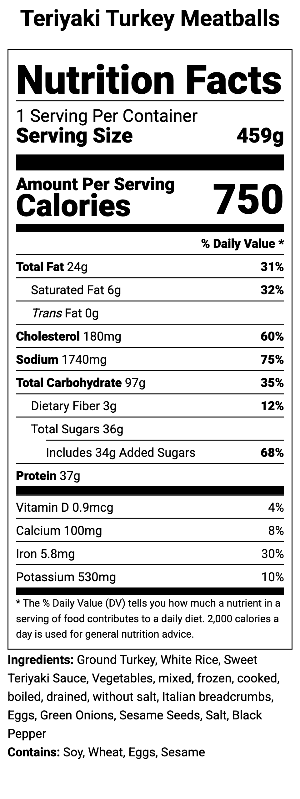 Three meatballs tossed in a sweet teriyaki sauce, served over a bed of veggie white rice and garnished with sesame seeds.