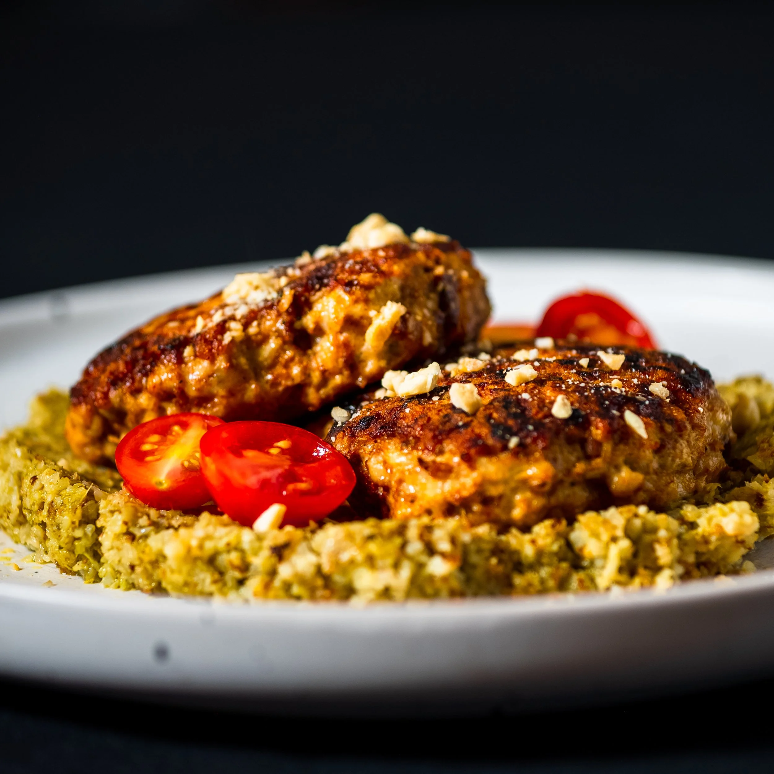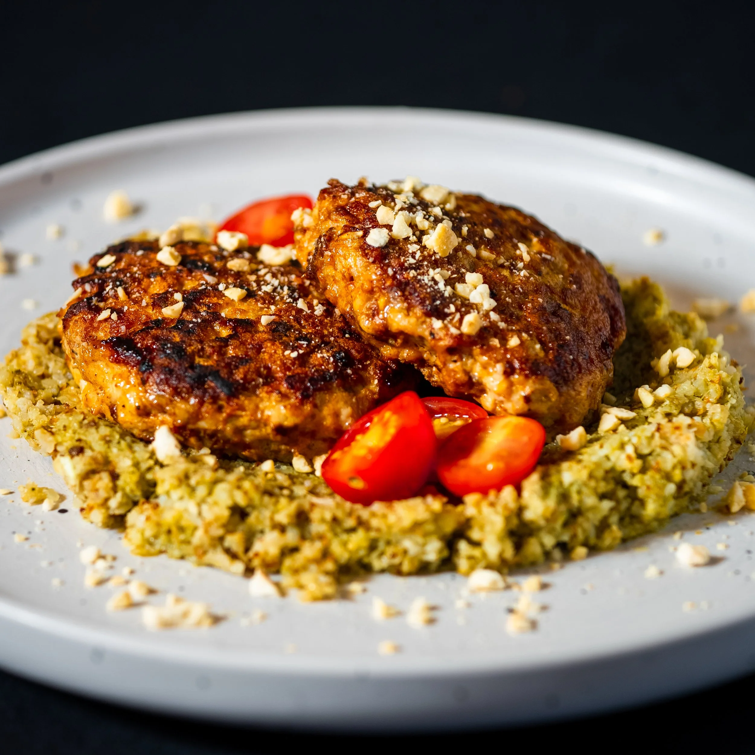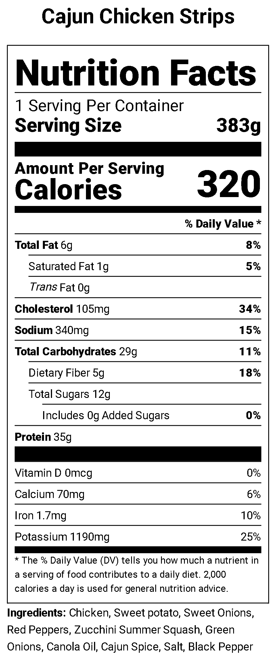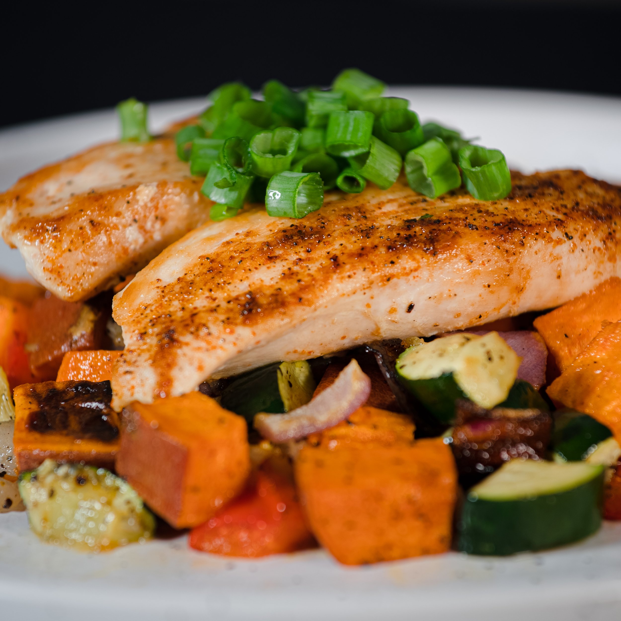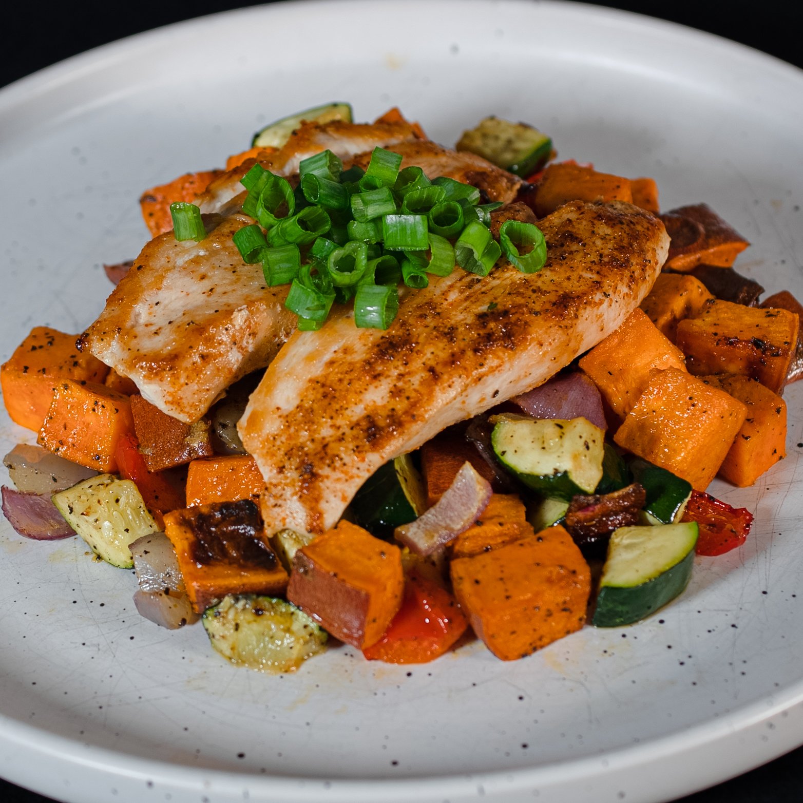 Pan-seared, cajun-seasoned chicken tenderloins complete with roasted sweet potatoes, a roasted vegetable medley, and topped with green onions.