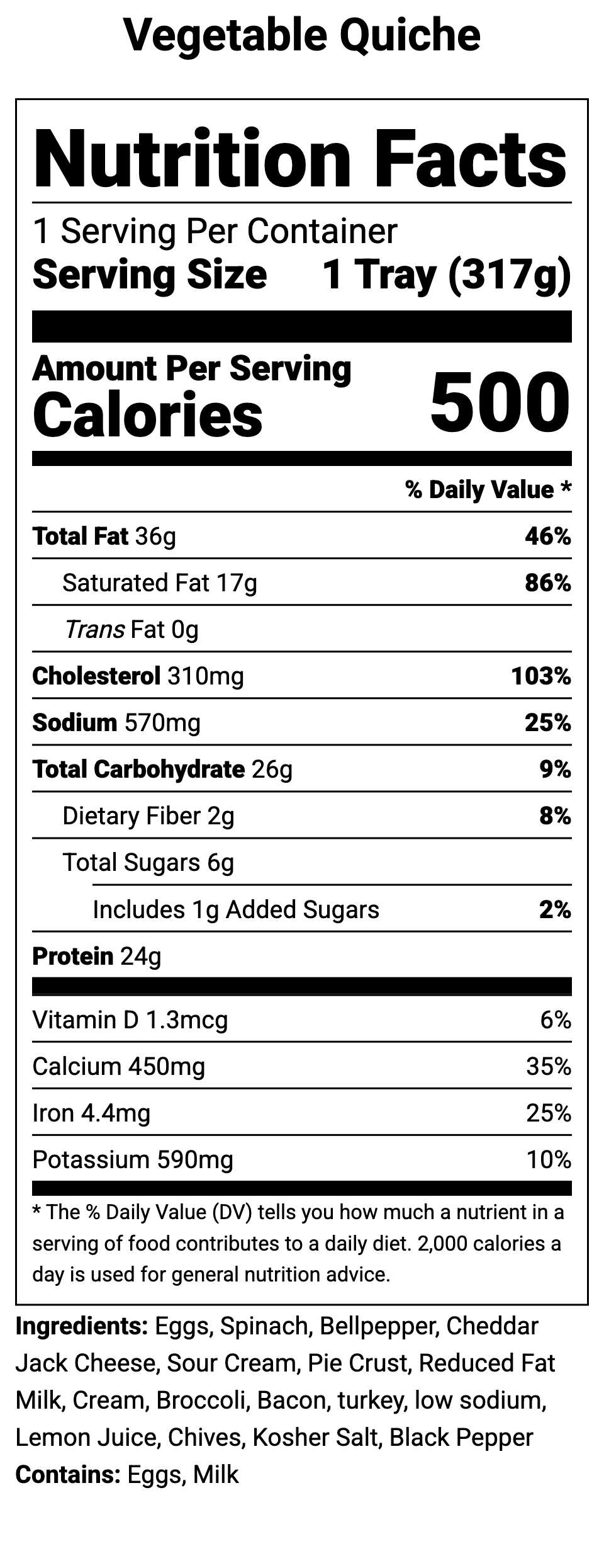 A PXP breakfast favorite! Egg quiche with a veggie medley, cheese blend, and turkey bacon bits, topped with a lemon chive crema and micro greens.